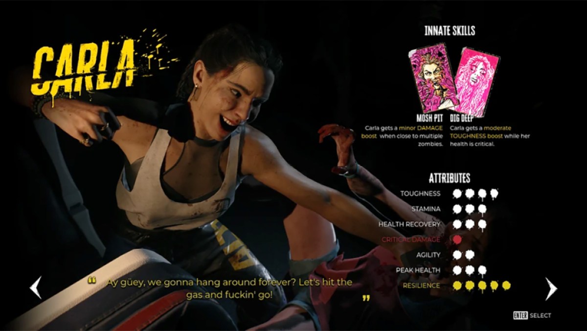 Carla is a solid pick for the same reasons, with similar stats to Ryan but worse innate skills. Mosh Pit noticeably buffs her damage when she's in the thick of the action, but Dig Deep's fairly useless. Le da a Carla resistencia al daño físico adicional cuando está en la salud crítica, pero en la práctica, un zombi que lleva a Carla a ese momento golpea lo suficientemente fuerte como para que Profunde no pueda salvarla o no tener la oportunidad de entrar en acción.
