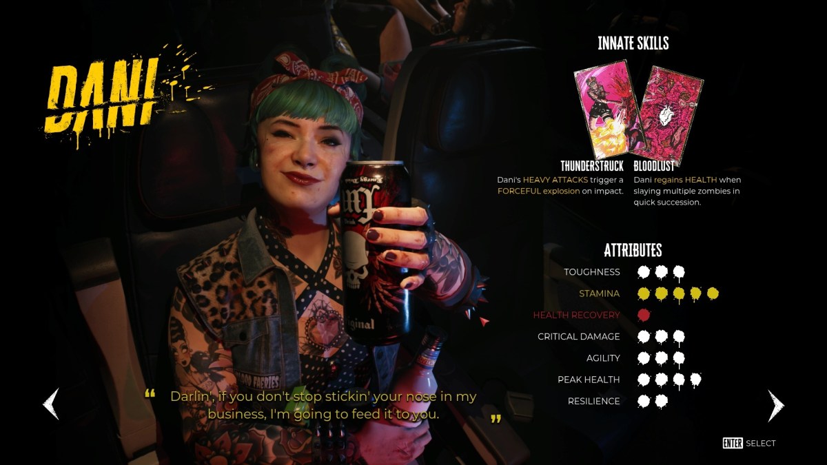| 3 | 5 | 1 | 3 | 3 | 4 | 2 | Thunderstruck: Dani's HEAVY ATTACKS trigger a FORCEFUL explosion on impact. Bloodlust: Dani regains HEALTH when slaying multiple zombies in quick succession. |