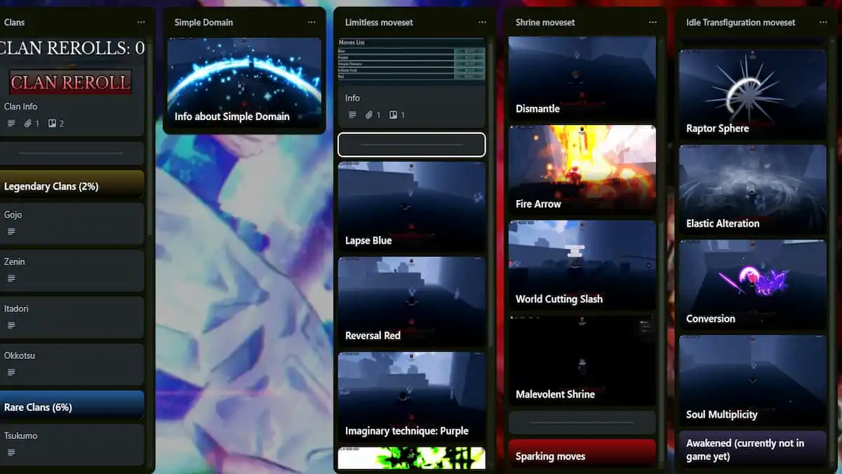 Seperti kebanyakan papan Trello di planet ini, semua kartu dalam warisan Sorcerer diatur secara vertikal, dengan setiap kolom berisi jenis informasi tertentu. Nah, apa artinya itu? Nah, jika Anda ingin informasi tentang klan Gojo dalam permainan. Yang harus Anda lakukan adalah melayang ke kolom klan dan membuka kartu gojo di bawahnya untuk mempelajari semua informasi tentang klan Gojo, mulai dari buff ke nerf.