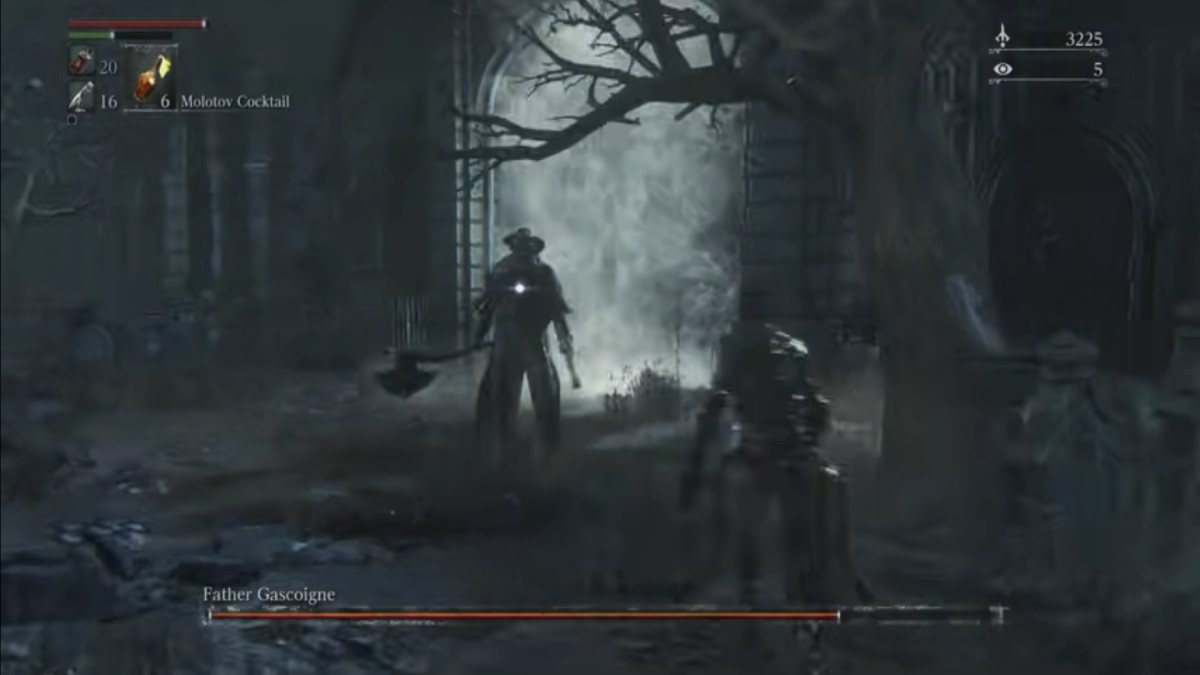 Father Gascoigne is a crazed hunter. He's not too difficult once you get the hang of things, but he's definitely one of the first major challenges you'll face in the game. He moves quickly and uses his gun often. The best way to get through him is to really get the parry timing down, since it'll help you shred him quickly.