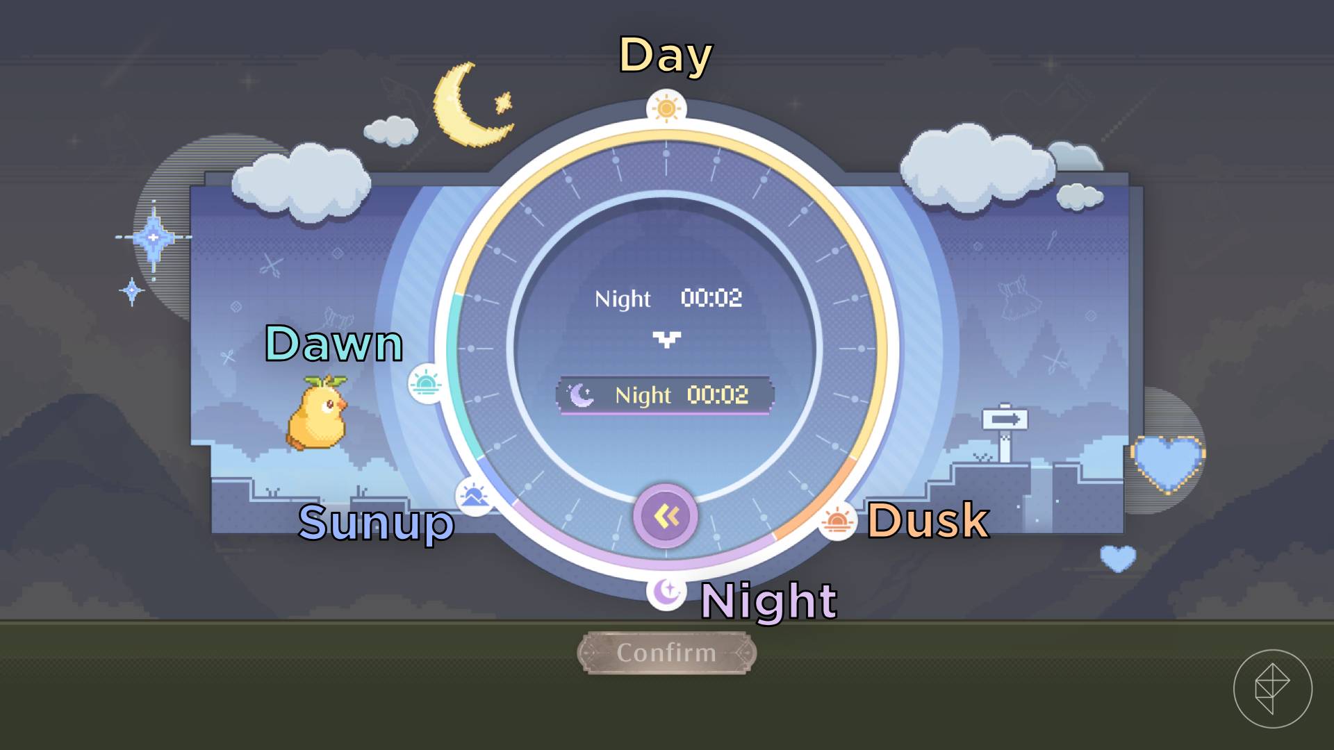 하루, 황혼, 밤, 선핑 및 새벽 : 시간을 30 분 단위로 전달하거나 시간을 하루 종일 설정할 수 있습니다.
